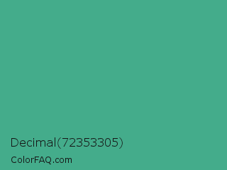 Decimal 72353305 Color is a normal green color and the nearest color is Mint #3eb489. Hex code #44ac8b and RGB value is rgb(68,172,139). In RGB color space, this color is composed of 27% red, 67% green, 55% blue, In CMYK color space, this color is composed of 60% cyan, 0% magenta, 19% yellow , 33% black , In HSL color space, this color has a hue angle of 161° , 43% saturation and 47% lightness.