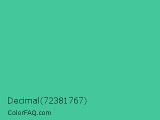 Decimal 72381767 Color is a normal green color and the nearest color is Ocean Green #48bf91. Hex code #44c79b and RGB value is rgb(68,199,155). In RGB color space, this color is composed of 27% red, 78% green, 61% blue, In CMYK color space, this color is composed of 66% cyan, 0% magenta, 22% yellow , 22% black , In HSL color space, this color has a hue angle of 160° , 54% saturation and 52% lightness.
