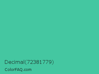 Decimal 72381779 Color is a normal green color and the nearest color is Puerto Rico #3fc1aa. Hex code #44c7a1 and RGB value is rgb(68,199,161). In RGB color space, this color is composed of 27% red, 78% green, 63% blue, In CMYK color space, this color is composed of 66% cyan, 0% magenta, 19% yellow , 22% black , In HSL color space, this color has a hue angle of 163° , 54% saturation and 52% lightness.