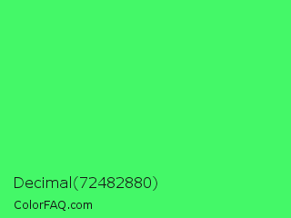 Decimal 72482880 Color is a light green color and the nearest color is Screamin Green #66ff66. Hex code #44f868 and RGB value is rgb(68,248,104). In RGB color space, this color is composed of 27% red, 97% green, 41% blue, In CMYK color space, this color is composed of 73% cyan, 0% magenta, 58% yellow , 3% black , In HSL color space, this color has a hue angle of 132° , 93% saturation and 62% lightness.