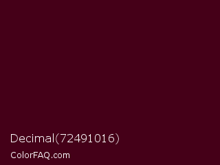 Decimal 72491016 Color is a very dark rose color and the nearest color is Cab Sav #4d0a18. Hex code #450018 and RGB value is rgb(69,0,24). In RGB color space, this color is composed of 27% red, 0% green, 9% blue, In CMYK color space, this color is composed of 0% cyan, 100% magenta, 65% yellow , 73% black , In HSL color space, this color has a hue angle of 339° , 100% saturation and 14% lightness.