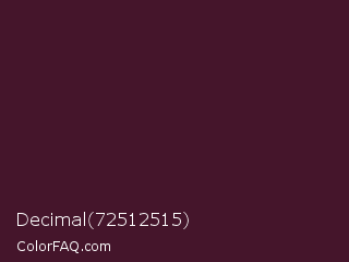 Decimal 72512515 Color is a very dark rose color and the nearest color is Crater Brown #462425. Hex code #45152b and RGB value is rgb(69,21,43). In RGB color space, this color is composed of 27% red, 8% green, 17% blue, In CMYK color space, this color is composed of 0% cyan, 70% magenta, 38% yellow , 73% black , In HSL color space, this color has a hue angle of 333° , 53% saturation and 18% lightness.