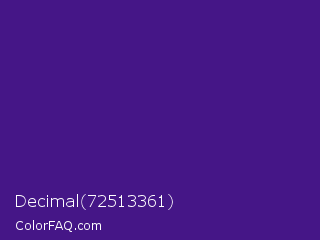 Decimal 72513361 Color is a normal violet color and the nearest color is Pixie Powder #391285. Hex code #451687 and RGB value is rgb(69,22,135). In RGB color space, this color is composed of 27% red, 9% green, 53% blue, In CMYK color space, this color is composed of 49% cyan, 84% magenta, 0% yellow , 47% black , In HSL color space, this color has a hue angle of 265° , 72% saturation and 31% lightness.
