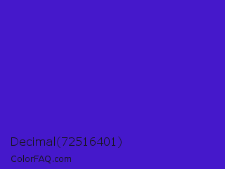Decimal 72516401 Color is a normal indigo color and the nearest color is Interdimensional Blue #360ccc. Hex code #4518cb and RGB value is rgb(69,24,203). In RGB color space, this color is composed of 27% red, 9% green, 80% blue, In CMYK color space, this color is composed of 66% cyan, 88% magenta, 0% yellow , 20% black , In HSL color space, this color has a hue angle of 255° , 79% saturation and 45% lightness.