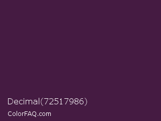 Decimal 72517986 Color is a very dark magenta color and the nearest color is Loulou #460b41. Hex code #451b42 and RGB value is rgb(69,27,66). In RGB color space, this color is composed of 27% red, 11% green, 26% blue, In CMYK color space, this color is composed of 0% cyan, 61% magenta, 4% yellow , 73% black , In HSL color space, this color has a hue angle of 304° , 44% saturation and 19% lightness.