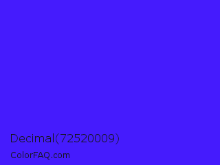 Decimal 72520009 Color is a normal indigo color and the nearest color is Han Purple #5218fa. Hex code #451bfd and RGB value is rgb(69,27,253). In RGB color space, this color is composed of 27% red, 11% green, 99% blue, In CMYK color space, this color is composed of 73% cyan, 89% magenta, 0% yellow , 1% black , In HSL color space, this color has a hue angle of 251° , 98% saturation and 55% lightness.