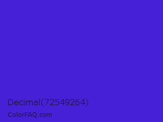 Decimal 72549264 Color is a normal indigo color and the nearest color is Interdimensional Blue #360ccc. Hex code #4520d6 and RGB value is rgb(69,32,214). In RGB color space, this color is composed of 27% red, 13% green, 84% blue, In CMYK color space, this color is composed of 68% cyan, 85% magenta, 0% yellow , 16% black , In HSL color space, this color has a hue angle of 252° , 74% saturation and 48% lightness.