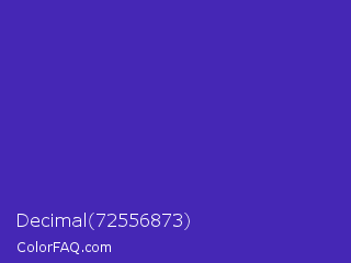 Decimal 72556873 Color is a normal indigo color and the nearest color is Ocean Blue #4f42b5. Hex code #4527b5 and RGB value is rgb(69,39,181). In RGB color space, this color is composed of 27% red, 15% green, 71% blue, In CMYK color space, this color is composed of 62% cyan, 78% magenta, 0% yellow , 29% black , In HSL color space, this color has a hue angle of 253° , 65% saturation and 43% lightness.