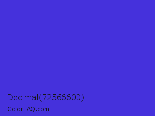 Decimal 72566600 Color is a normal indigo color and the nearest color is Palatinate Blue #273be2. Hex code #4531dc and RGB value is rgb(69,49,220). In RGB color space, this color is composed of 27% red, 19% green, 86% blue, In CMYK color space, this color is composed of 69% cyan, 78% magenta, 0% yellow , 14% black , In HSL color space, this color has a hue angle of 247° , 71% saturation and 53% lightness.