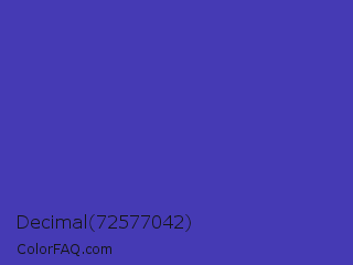 Decimal 72577042 Color is a normal indigo color and the nearest color is Ocean Blue #4f42b5. Hex code #453ab4 and RGB value is rgb(69,58,180). In RGB color space, this color is composed of 27% red, 23% green, 71% blue, In CMYK color space, this color is composed of 62% cyan, 68% magenta, 0% yellow , 29% black , In HSL color space, this color has a hue angle of 245° , 51% saturation and 47% lightness.