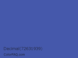Decimal 72631939 Color is a normal blue color and the nearest color is Liberty #545aa7. Hex code #4558ab and RGB value is rgb(69,88,171). In RGB color space, this color is composed of 27% red, 35% green, 67% blue, In CMYK color space, this color is composed of 60% cyan, 49% magenta, 0% yellow , 33% black , In HSL color space, this color has a hue angle of 229° , 43% saturation and 47% lightness.