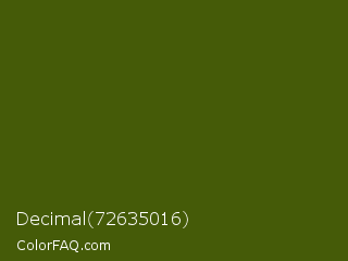 Decimal 72635016 Color is a very dark lime color and the nearest color is Verdun Green #495400. Hex code #455b08 and RGB value is rgb(69,91,8). In RGB color space, this color is composed of 27% red, 36% green, 3% blue, In CMYK color space, this color is composed of 24% cyan, 0% magenta, 91% yellow , 64% black , In HSL color space, this color has a hue angle of 76° , 84% saturation and 19% lightness.