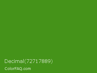 Decimal 72717889 Color is a normal green color and the nearest color is Vida Loca #549019. Hex code #459319 and RGB value is rgb(69,147,25). In RGB color space, this color is composed of 27% red, 58% green, 10% blue, In CMYK color space, this color is composed of 53% cyan, 0% magenta, 83% yellow , 42% black , In HSL color space, this color has a hue angle of 98° , 71% saturation and 34% lightness.