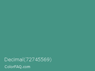 Decimal 72745569 Color is a normal cyan color and the nearest color is Wintergreen Dream #56887d. Hex code #459585 and RGB value is rgb(69,149,133). In RGB color space, this color is composed of 27% red, 58% green, 52% blue, In CMYK color space, this color is composed of 54% cyan, 0% magenta, 11% yellow , 42% black , In HSL color space, this color has a hue angle of 168° , 37% saturation and 43% lightness.