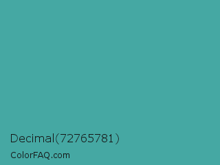 Decimal 72765781 Color is a normal cyan color and the nearest color is Keppel #3ab09e. Hex code #45a8a3 and RGB value is rgb(69,168,163). In RGB color space, this color is composed of 27% red, 66% green, 64% blue, In CMYK color space, this color is composed of 59% cyan, 0% magenta, 3% yellow , 34% black , In HSL color space, this color has a hue angle of 177° , 42% saturation and 46% lightness.