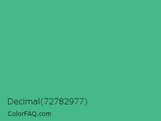 Decimal 72782977 Color is a normal green color and the nearest color is Mint #3eb489. Hex code #45b989 and RGB value is rgb(69,185,137). In RGB color space, this color is composed of 27% red, 73% green, 54% blue, In CMYK color space, this color is composed of 63% cyan, 0% magenta, 26% yellow , 27% black , In HSL color space, this color has a hue angle of 155° , 46% saturation and 50% lightness.