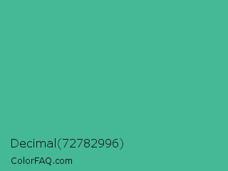 Decimal 72782996 Color is a normal green color and the nearest color is Ocean Green #48bf91. Hex code #45b996 and RGB value is rgb(69,185,150). In RGB color space, this color is composed of 27% red, 73% green, 59% blue, In CMYK color space, this color is composed of 63% cyan, 0% magenta, 19% yellow , 27% black , In HSL color space, this color has a hue angle of 162° , 46% saturation and 50% lightness.