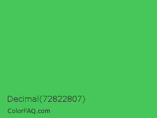 Decimal 72822807 Color is a normal green color and the nearest color is UFO Green #3cd070. Hex code #45c759 and RGB value is rgb(69,199,89). In RGB color space, this color is composed of 27% red, 78% green, 35% blue, In CMYK color space, this color is composed of 65% cyan, 0% magenta, 55% yellow , 22% black , In HSL color space, this color has a hue angle of 129° , 54% saturation and 53% lightness.