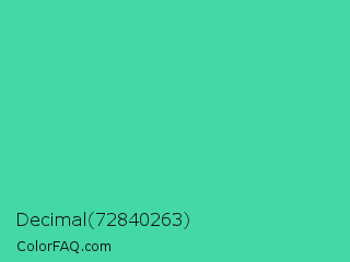 Decimal 72840263 Color is a normal green color and the nearest color is Eucalyptus #44d7a8. Hex code #45d8a7 and RGB value is rgb(69,216,167). In RGB color space, this color is composed of 27% red, 85% green, 65% blue, In CMYK color space, this color is composed of 68% cyan, 0% magenta, 23% yellow , 15% black , In HSL color space, this color has a hue angle of 160° , 65% saturation and 56% lightness.