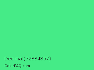 Decimal 72884857 Color is a normal green color and the nearest color is Very Light Malachite Green #64e986. Hex code #45eb87 and RGB value is rgb(69,235,135). In RGB color space, this color is composed of 27% red, 92% green, 53% blue, In CMYK color space, this color is composed of 71% cyan, 0% magenta, 43% yellow , 8% black , In HSL color space, this color has a hue angle of 144° , 81% saturation and 60% lightness.