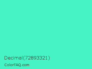 Decimal 72893321 Color is a light cyan color and the nearest color is Turquoise #40e0d0. Hex code #45f3c5 and RGB value is rgb(69,243,197). In RGB color space, this color is composed of 27% red, 95% green, 77% blue, In CMYK color space, this color is composed of 72% cyan, 0% magenta, 19% yellow , 5% black , In HSL color space, this color has a hue angle of 164° , 88% saturation and 61% lightness.