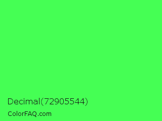 Decimal 72905544 Color is a light green color and the nearest color is Screamin Green #66ff66. Hex code #45ff54 and RGB value is rgb(69,255,84). In RGB color space, this color is composed of 27% red, 100% green, 33% blue, In CMYK color space, this color is composed of 73% cyan, 0% magenta, 67% yellow , 0% black , In HSL color space, this color has a hue angle of 125° , 100% saturation and 64% lightness.