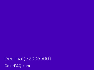 Decimal 72906500 Color is a normal violet color and the nearest color is Interdimensional Blue #360ccc. Hex code #4600b8 and RGB value is rgb(70,0,184). In RGB color space, this color is composed of 27% red, 0% green, 72% blue, In CMYK color space, this color is composed of 62% cyan, 100% magenta, 0% yellow , 28% black , In HSL color space, this color has a hue angle of 263° , 100% saturation and 36% lightness.