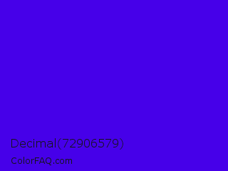 Decimal 72906579 Color is a normal indigo color and the nearest color is Electric Ultramarine #3f00ff. Hex code #4600e9 and RGB value is rgb(70,0,233). In RGB color space, this color is composed of 27% red, 0% green, 91% blue, In CMYK color space, this color is composed of 70% cyan, 100% magenta, 0% yellow , 9% black , In HSL color space, this color has a hue angle of 258° , 100% saturation and 46% lightness.