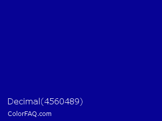 Decimal 4560489 Color is a dark indigo color and the nearest color is Duke Blue #00009c. Hex code #070395 and RGB value is rgb(7,3,149). In RGB color space, this color is composed of 3% red, 1% green, 58% blue, In CMYK color space, this color is composed of 95% cyan, 98% magenta, 0% yellow , 42% black , In HSL color space, this color has a hue angle of 242° , 96% saturation and 30% lightness.