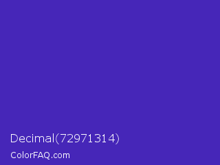 Decimal 72971314 Color is a normal indigo color and the nearest color is Ocean Blue #4f42b5. Hex code #4626b8 and RGB value is rgb(70,38,184). In RGB color space, this color is composed of 27% red, 15% green, 72% blue, In CMYK color space, this color is composed of 62% cyan, 79% magenta, 0% yellow , 28% black , In HSL color space, this color has a hue angle of 253° , 66% saturation and 44% lightness.