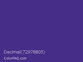 Decimal 72978805 Color is a normal indigo color and the nearest color is Spanish Violet #4c2882. Hex code #462d87 and RGB value is rgb(70,45,135). In RGB color space, this color is composed of 27% red, 18% green, 53% blue, In CMYK color space, this color is composed of 48% cyan, 67% magenta, 0% yellow , 47% black , In HSL color space, this color has a hue angle of 257° , 50% saturation and 35% lightness.