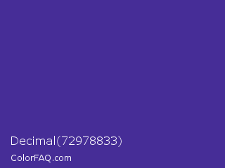 Decimal 72978833 Color is a normal indigo color and the nearest color is Daisy Bush #4f2398. Hex code #462d97 and RGB value is rgb(70,45,151). In RGB color space, this color is composed of 27% red, 18% green, 59% blue, In CMYK color space, this color is composed of 54% cyan, 70% magenta, 0% yellow , 41% black , In HSL color space, this color has a hue angle of 254° , 54% saturation and 38% lightness.