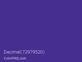 Decimal 72979520 Color is a normal indigo color and the nearest color is KSU Purple #512888. Hex code #462e90 and RGB value is rgb(70,46,144). In RGB color space, this color is composed of 27% red, 18% green, 56% blue, In CMYK color space, this color is composed of 51% cyan, 68% magenta, 0% yellow , 44% black , In HSL color space, this color has a hue angle of 255° , 52% saturation and 37% lightness.