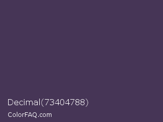 Decimal 73404788 Color is a dark purple color and the nearest color is Voodoo #533455. Hex code #463556 and RGB value is rgb(70,53,86). In RGB color space, this color is composed of 27% red, 21% green, 34% blue, In CMYK color space, this color is composed of 19% cyan, 38% magenta, 0% yellow , 66% black , In HSL color space, this color has a hue angle of 271° , 24% saturation and 27% lightness.