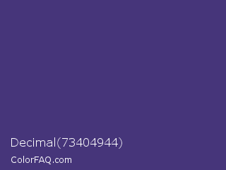 Decimal 73404944 Color is a normal indigo color and the nearest color is Minsk #3f307f. Hex code #46357a and RGB value is rgb(70,53,122). In RGB color space, this color is composed of 27% red, 21% green, 48% blue, In CMYK color space, this color is composed of 43% cyan, 57% magenta, 0% yellow , 52% black , In HSL color space, this color has a hue angle of 255° , 39% saturation and 34% lightness.