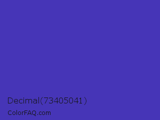 Decimal 73405041 Color is a normal indigo color and the nearest color is Ocean Blue #4f42b5. Hex code #4635b7 and RGB value is rgb(70,53,183). In RGB color space, this color is composed of 27% red, 21% green, 72% blue, In CMYK color space, this color is composed of 62% cyan, 71% magenta, 0% yellow , 28% black , In HSL color space, this color has a hue angle of 248° , 55% saturation and 46% lightness.