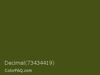 Decimal 73434419 Color is a very dark lime color and the nearest color is Army Green #4b5320. Hex code #465215 and RGB value is rgb(70,82,21). In RGB color space, this color is composed of 27% red, 32% green, 8% blue, In CMYK color space, this color is composed of 15% cyan, 0% magenta, 74% yellow , 68% black , In HSL color space, this color has a hue angle of 72° , 59% saturation and 20% lightness.