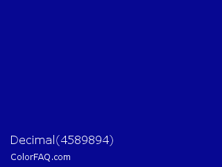 Decimal 4589894 Color is a dark blue color and the nearest color is Ultramarine #120a8f. Hex code #070892 and RGB value is rgb(7,8,146). In RGB color space, this color is composed of 3% red, 3% green, 57% blue, In CMYK color space, this color is composed of 95% cyan, 95% magenta, 0% yellow , 43% black , In HSL color space, this color has a hue angle of 240° , 91% saturation and 30% lightness.