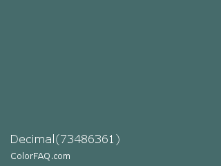 Decimal 73486361 Color is a normal cyan color and the nearest color is Deep Space Sparkle #4a646c. Hex code #466b6b and RGB value is rgb(70,107,107). In RGB color space, this color is composed of 27% red, 42% green, 42% blue, In CMYK color space, this color is composed of 35% cyan, 0% magenta, 0% yellow , 58% black , In HSL color space, this color has a hue angle of 180° , 21% saturation and 35% lightness.