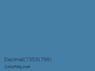 Decimal 73531799 Color is a normal blue color and the nearest color is Wedgewood #4e7f9e. Hex code #467fa5 and RGB value is rgb(70,127,165). In RGB color space, this color is composed of 27% red, 50% green, 65% blue, In CMYK color space, this color is composed of 58% cyan, 23% magenta, 0% yellow , 35% black , In HSL color space, this color has a hue angle of 204° , 40% saturation and 46% lightness.