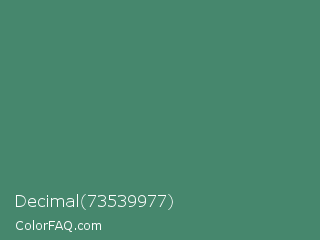 Decimal 73539977 Color is a normal green color and the nearest color is Viridian #40826d. Hex code #46876d and RGB value is rgb(70,135,109). In RGB color space, this color is composed of 27% red, 53% green, 43% blue, In CMYK color space, this color is composed of 48% cyan, 0% magenta, 19% yellow , 47% black , In HSL color space, this color has a hue angle of 156° , 32% saturation and 40% lightness.