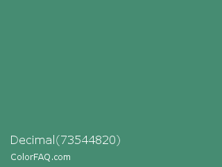 Decimal 73544820 Color is a normal green color and the nearest color is Viridian #40826d. Hex code #468c72 and RGB value is rgb(70,140,114). In RGB color space, this color is composed of 27% red, 55% green, 45% blue, In CMYK color space, this color is composed of 50% cyan, 0% magenta, 19% yellow , 45% black , In HSL color space, this color has a hue angle of 158° , 33% saturation and 41% lightness.