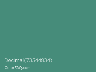 Decimal 73544834 Color is a normal cyan color and the nearest color is Wintergreen Dream #56887d. Hex code #468c7a and RGB value is rgb(70,140,122). In RGB color space, this color is composed of 27% red, 55% green, 48% blue, In CMYK color space, this color is composed of 50% cyan, 0% magenta, 13% yellow , 45% black , In HSL color space, this color has a hue angle of 165° , 33% saturation and 41% lightness.