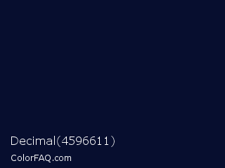 Decimal 4596611 Color is a very dark blue color and the nearest color is Midnight #011635. Hex code #070e2f and RGB value is rgb(7,14,47). In RGB color space, this color is composed of 3% red, 5% green, 18% blue, In CMYK color space, this color is composed of 85% cyan, 70% magenta, 0% yellow , 82% black , In HSL color space, this color has a hue angle of 230° , 74% saturation and 11% lightness.