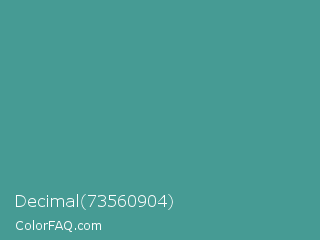 Decimal 73560904 Color is a normal cyan color and the nearest color is Zomp #39a78e. Hex code #469b94 and RGB value is rgb(70,155,148). In RGB color space, this color is composed of 27% red, 61% green, 58% blue, In CMYK color space, this color is composed of 55% cyan, 0% magenta, 5% yellow , 39% black , In HSL color space, this color has a hue angle of 175° , 38% saturation and 44% lightness.