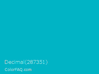 Decimal 287351 Color is a normal cyan color and the nearest color is Turquoise Surf #00c5cd. Hex code #00b4c5 and RGB value is rgb(0,180,197). In RGB color space, this color is composed of 0% red, 71% green, 77% blue, In CMYK color space, this color is composed of 100% cyan, 9% magenta, 0% yellow , 23% black , In HSL color space, this color has a hue angle of 185° , 100% saturation and 39% lightness.