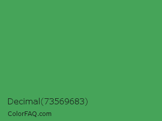 Decimal 73569683 Color is a normal green color and the nearest color is Chateau Green #40a860. Hex code #46a459 and RGB value is rgb(70,164,89). In RGB color space, this color is composed of 27% red, 64% green, 35% blue, In CMYK color space, this color is composed of 57% cyan, 0% magenta, 46% yellow , 36% black , In HSL color space, this color has a hue angle of 132° , 40% saturation and 46% lightness.