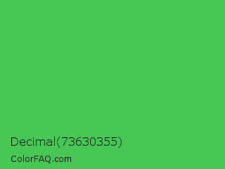 Decimal 73630355 Color is a normal green color and the nearest color is UFO Green #3cd070. Hex code #46c655 and RGB value is rgb(70,198,85). In RGB color space, this color is composed of 27% red, 78% green, 33% blue, In CMYK color space, this color is composed of 65% cyan, 0% magenta, 57% yellow , 22% black , In HSL color space, this color has a hue angle of 127° , 53% saturation and 53% lightness.