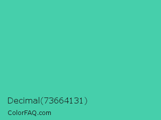 Decimal 73664131 Color is a normal cyan color and the nearest color is Eucalyptus #44d7a8. Hex code #46cfab and RGB value is rgb(70,207,171). In RGB color space, this color is composed of 27% red, 81% green, 67% blue, In CMYK color space, this color is composed of 66% cyan, 0% magenta, 17% yellow , 19% black , In HSL color space, this color has a hue angle of 164° , 59% saturation and 54% lightness.
