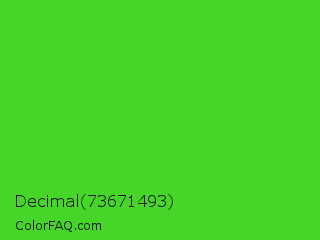 Decimal 73671493 Color is a normal green color and the nearest color is Harlequin Green #46cb18. Hex code #46d629 and RGB value is rgb(70,214,41). In RGB color space, this color is composed of 27% red, 84% green, 16% blue, In CMYK color space, this color is composed of 67% cyan, 0% magenta, 81% yellow , 16% black , In HSL color space, this color has a hue angle of 110° , 68% saturation and 50% lightness.